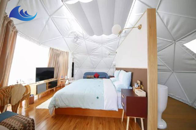 帐篷酒店采用高强度中空铝合金结构或者是钢结构,表面具备有防腐处理,优选膜结构顶棚,安全耐用,防水、阻燃、防紫外线。